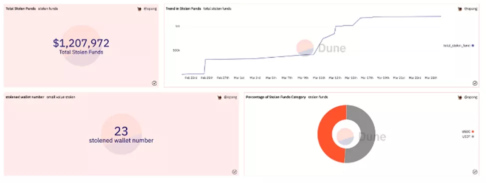 Жертвами атаки стали 73 290 пользователей. 23 из них перевели на кошелек злоумышленника суммарно $1,2 млн примерно в равной пропорции между USDT и USDC.