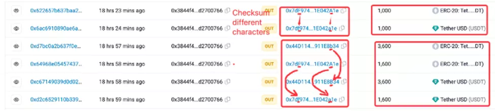 Во второй схеме мошенник создает фейковые токены с аналогичным именем и создает записи о передаче пользователю того же количества. Фишинговый кошелек и исходный адрес имеют точно такое же количество цифр в визуализации в браузере, с отличием в регистре одной или двух букв в результате проверки контрольной суммы.