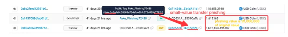 В первой схеме злоумышленник уменьшает исходную сумму в десятки или сотни тысяч раз. Затем он пересылает актив жертве через фишинговый кошелек, чтобы пропустить проверку традиционного фишинга токенов с нулевой стоимостью в Etherscan. Таким образом, за счет фактических переводов повышается доверие к адресу.