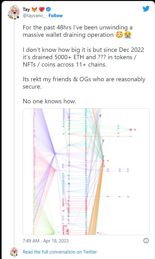 По словам разработчика MetaMask Тай (Tay), с декабря 2022 года с кошельков MetaMask было украдено более 5000 эфиров.