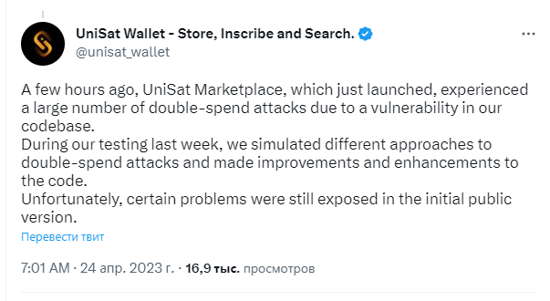 Во время тестирования на прошлой неделе мы смоделировали различные подходы к атакам с двойными расходами и внесли улучшения в код, — написано в аккаунте UniSat Wallet в Твиттере.