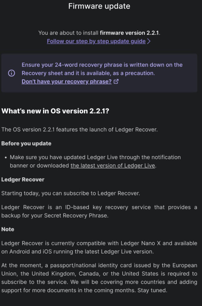 Новая функция Ledger Recover позволяет восстанавливать Seed-фразу с помощью третьих лиц. Фраза разделяется на 3 фрагмента и отправляется неизвестным сторонним людям/организациям в зашифрованном виде после одобрения пользователем. Затем ее можно восстановить, подтвердив свою личность через процедуру KYC с предоставлением паспортных данных.