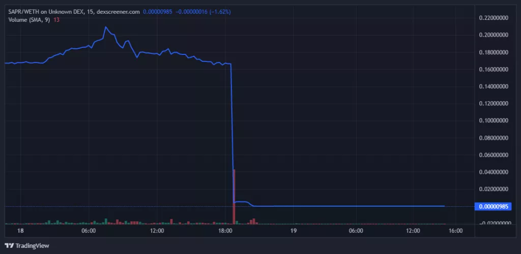 Команда вывела из пулов всю ликвидность в ETH, и продала за эфир собственные токены проекта SAPR. Цена актива обвалилась до нуля.