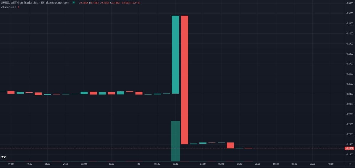 В результате хакерской атаки JIMBO сначала подорожал на 29%, а затем стремительно подешевел на 39%. После небольшого отскока нисходящая тенденция продолжилась, и сейчас цена токена на бирже Trader Joe колеблется в районе $ 0,18.