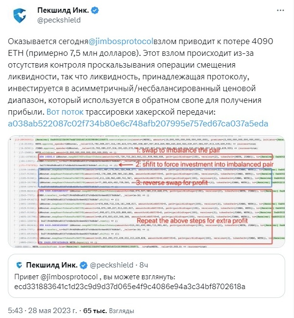 Шокирующим событием стало то, что Jimbos, протокол ликвидности Arbitrum, недавно был взломан хакером. Киберпреступник скрылся с 4090 Ethereum (ETH), что соответствует примерно 7,5 миллионам долларов по текущему курсу.