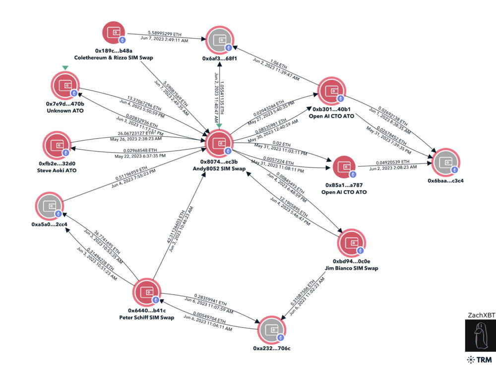 По словам специалиста по блокчейну ZachXBT, на данный момент мошенники украли криптовалюту на сумму почти 1 миллион долларов. Аккаунты принадлежат таким известным фигурам, как основатель Pudgy Penguins Коул Вильмен, ди-джей Стив Аоки и редактор журнала Bitcoin Magazine Пит Риццо.