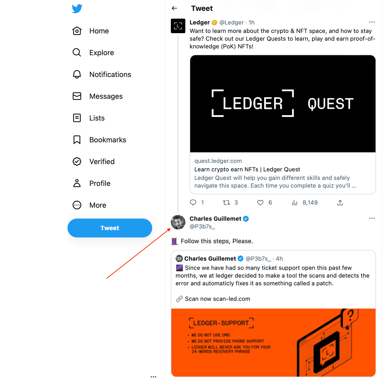 В данном случае мошенник выдавал себя за технического директора Ledger Шарля Гийома и просил перейти по ссылке для «исправления проблем». Вот эта публикация.