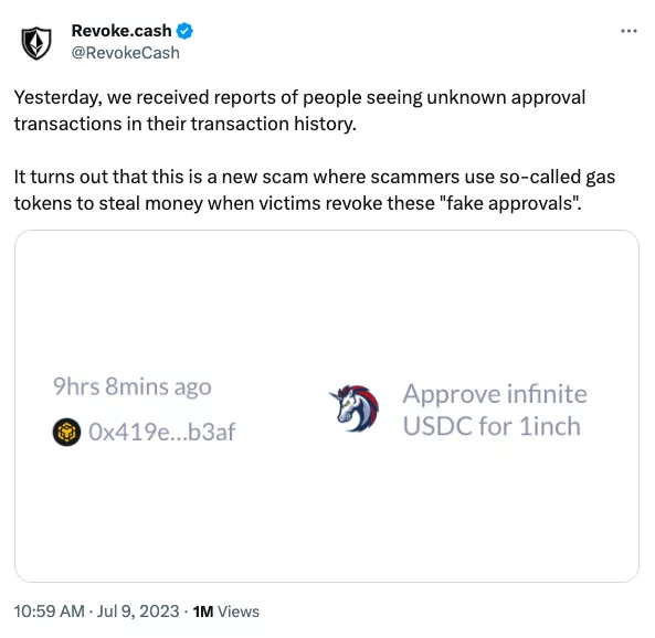Представители проекта объяснили, что злоумышленники начали отправлять пользователям фейковые токены, которые в интерфейсе Revoke требовали дополнительного подтверждения. Смарт-контракт монет создавался таким образом, при котором отмена транзакции требовала огромной комиссии.