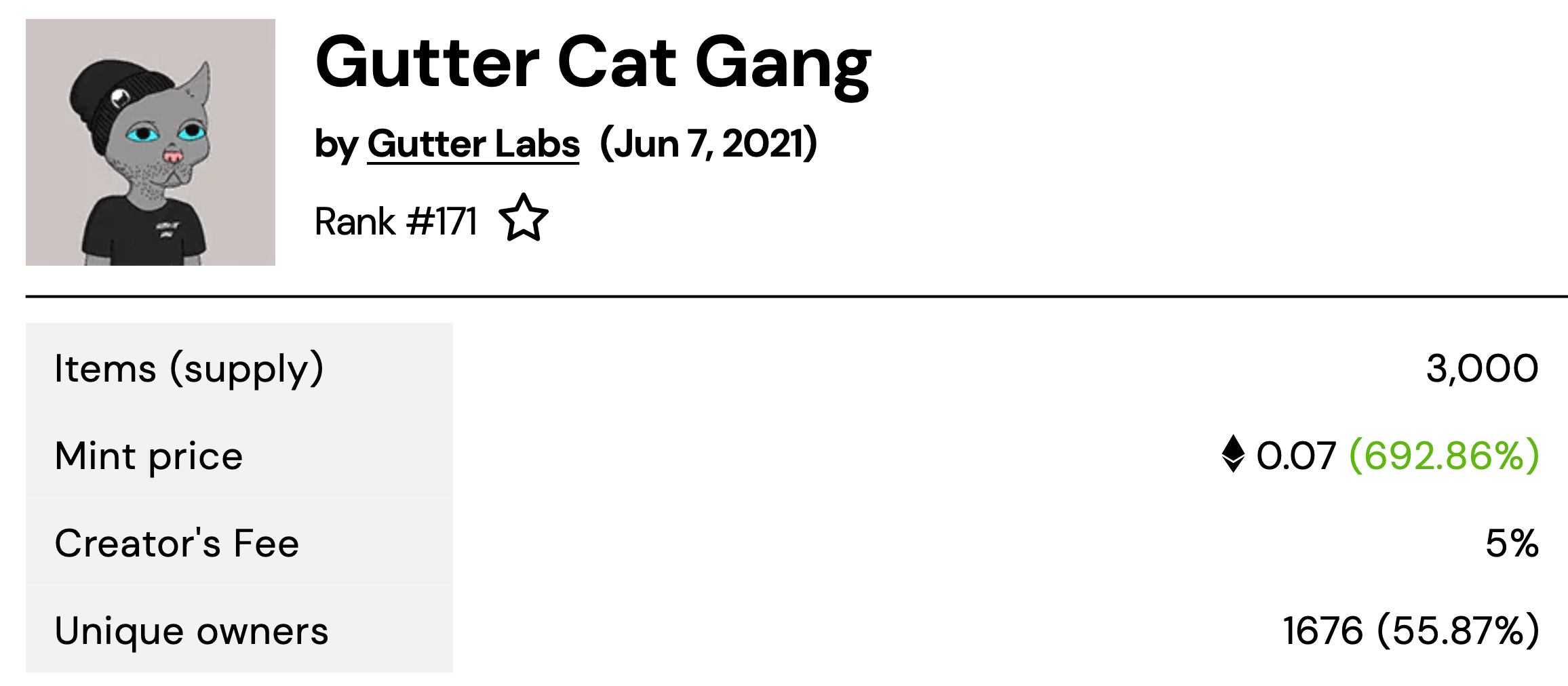 Статистика $NFT-коллекции под названием Gutter Cat Gang