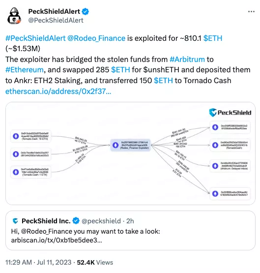 Хакер вывел из DeFi-протокола Rodeo Finance в сети Arbitrum 810,1 ETH (~$1,5 млн на момент написания) посредством манипуляций с оракулом.