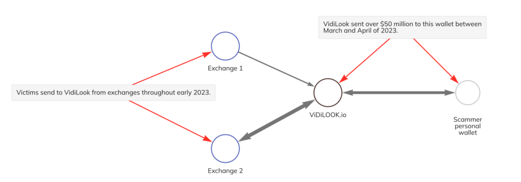 Оба мошеннических проекта прекратили своё существование после исчезновения их создателей с деньгами инвесторов, то есть вследствие так называемого экзит-скама. Соответствующую схему движения украденных средств с VidiLook отобразили на графе ниже.