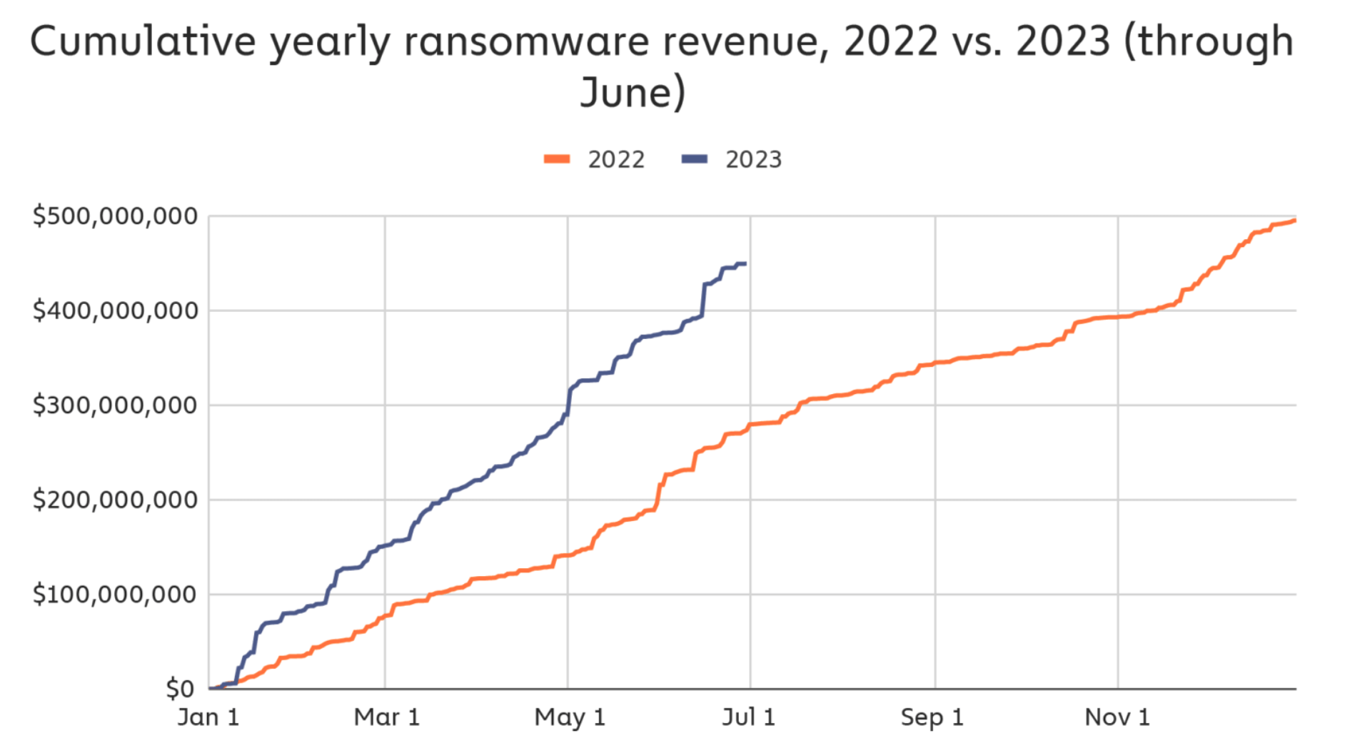 По сравнению с 2022 годом, распространяющие вымогательское ПО хакеры уже «заработали» заметно больше денег. За первые полгода они украли почти 450 миллионов долларов, при этом за аналогичный период прошлого года они получили лишь около 380 миллионов долларов. Если темпы прироста средств в этой сфере сохранятся, то к концу 2023 года убытки от вымогательского ПО достигнут приблизительно 900 миллионов долларов, отмечают аналитики.