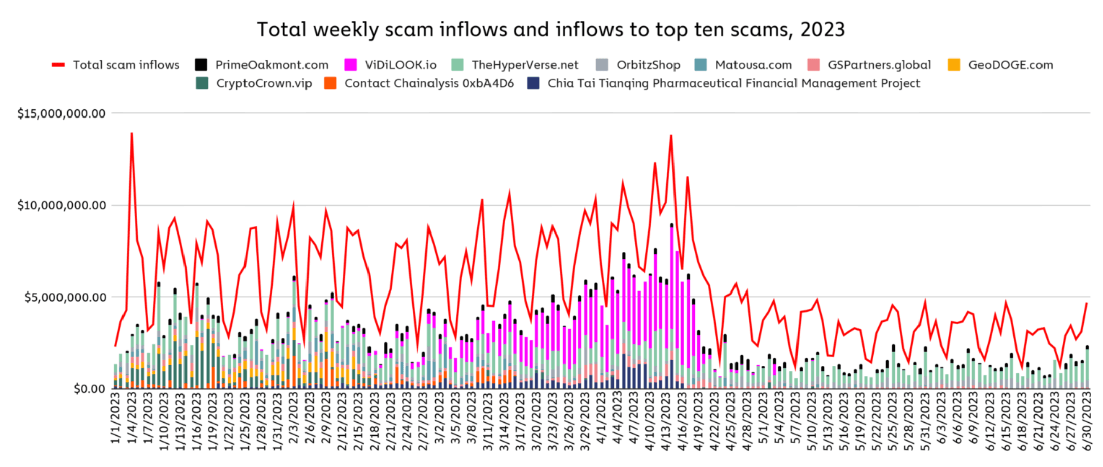 Ещё один график показывает притоки средств по неделям на топ-10 мошеннических площадок по типу финансовых пирамид, фейковых инвестиционных платформ и так далее. Аналитики отметили, что существенное снижение активности в этой категории произошло из-за коллапса двух крупнейших подобных схем – VidiLook и Chia Tai Tianqing Pharmaceutical Financial Management.