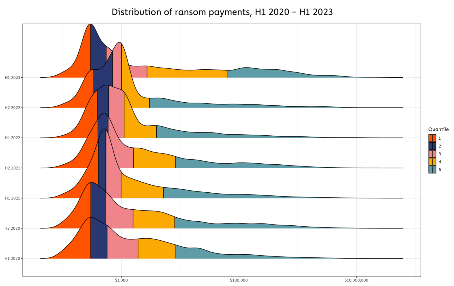 Согласно данным источников CryptoPotato, рост активности вымогателей связан со сменой их приоритетов. Теперь они больше нацелены на крупные организации и криптокомпании, которые в состоянии выплатить сравнительно большой выкуп. В то же время выросло и количество успешных небольших по масштабу атак. Обе тенденции хорошо видны на приведенном ниже графике, который показывает, как изменилось распределение размеров платежей за вымогательство с 2020 года.