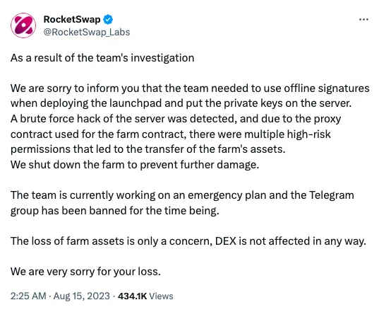 Позднее разработчики поделились дальнейшими планами для разрешения ситуации. Сначала RocketSwap развернет новый фарм-контракт с открытым исходным кодом. Команда проекта также прекратит самостоятельный выпуск новых токенов и сохранит только права с низким уровнем риска для распределения новых пулов.