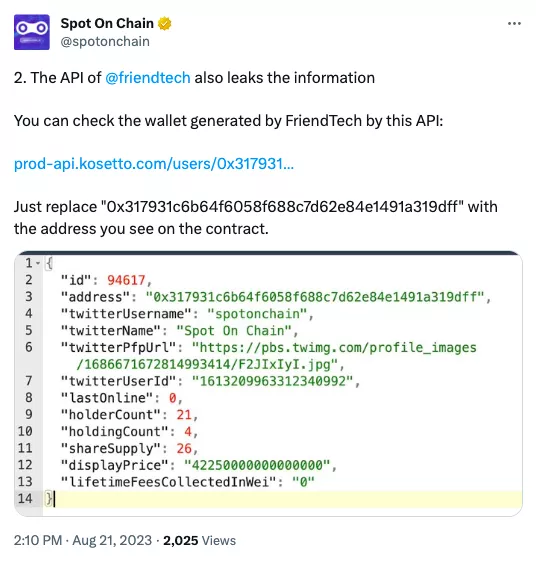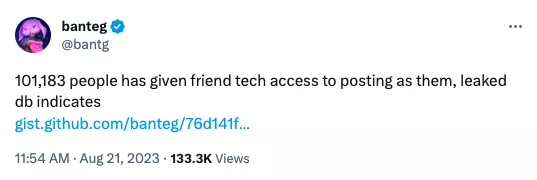 Участник сообщества Yearn Finance под псевдонимом Banteg сообщил об утечке данных 101 183 человек, которые привязали аккаунт X (ранее Twitter) к Web3-соцсети Friend.Tech.
