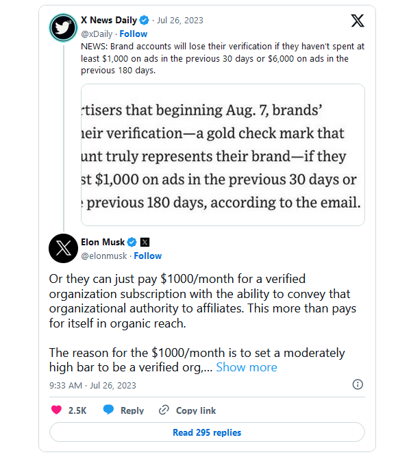 Он также сослался на твит главы X Илона Маска от 26 июля, где тот пояснил принцип работы системы верификации. Так, компании могут платить $1000 в месяц для получения значка проверенной организации, который доступен для передачи аффилированным лицам. Тогда он подчеркивал, что такая цена должна отсеять мошенников.