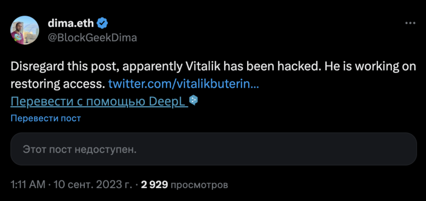 На данный момент пост с фишинговой ссылкой уже удален — это может означать, что Виталик восстановил доступ к профилю. Соучредитель Ethereum пока не прокомментировал инцидент.