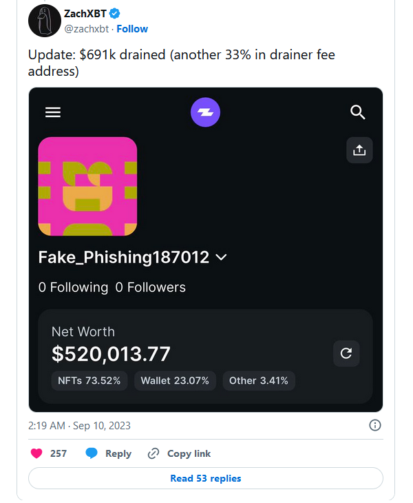 Что произошло? 10 сентября хакеры взломали аккаунт сооснователя блокчейна Ethereum Виталика Бутерина в X (ранее Twitter) и разместили в нем фишинговую ссылку. Отец программиста Дмитрий Бутерин призвал пользователей игнорировать пост, добавив, что тот уже работает над восстановлением доступа. Позже пост с вредоносной ссылкой был удален, однако, по информации исследователя ZachXBT, сумма ущерба составила $691 000 в цифровых активах.