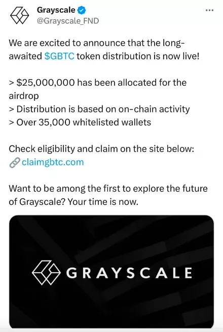 На прошлой неделе злоумышленники воспользовались ажиотажем вокруг Grayscale Investments после удовлетворения ее ходатайства в деле против SEC. В X появилось сообщение о раздаче токенов на $25 млн, связанных с флагманским трастом фирмы (GBTC).