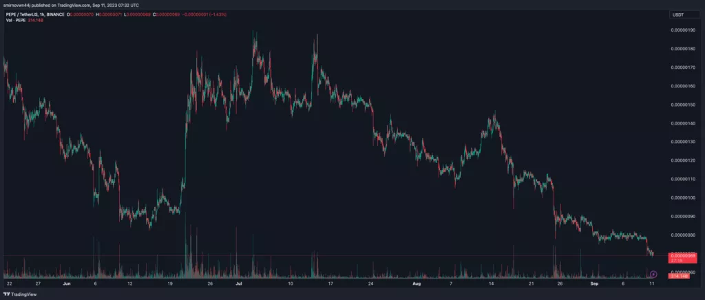 За прошедшую неделю актив упал на 12%, за месяц — на 47%. На момент написания монета торгуется по $0,0000007.