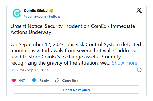 После того, как системы контроля CoinEx зафиксировали аномальный отток средств, биржа приостановила работу кошельков для проведения технических работ. В настоящий момент ввод и вывод средств недоступны. Сотрудники ведут собственное внутреннее расследование инцидента. Они заверили пользователей, что затронутые средства составляют лишь малую часть активов биржи.