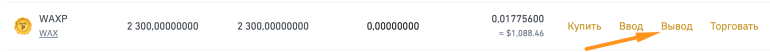 2. Покупаем нужное количество WAXP на бирже. Нажимаем “Вывести”.