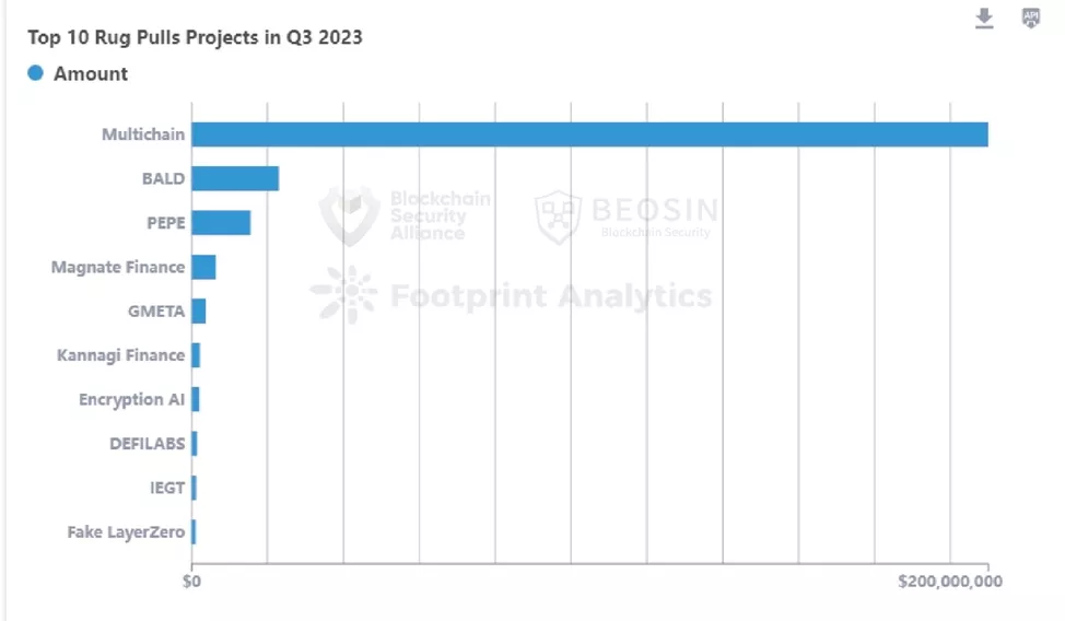 Среди rug pull особенно выделились Multichain ($210 млн), Bald ($23 млн) и Pepe ($15,5 млн).