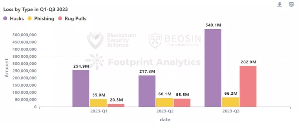 The total losses from hacks, phishing scams, and rug pulls in Web3 reached $889.26 million in Q3 2023.