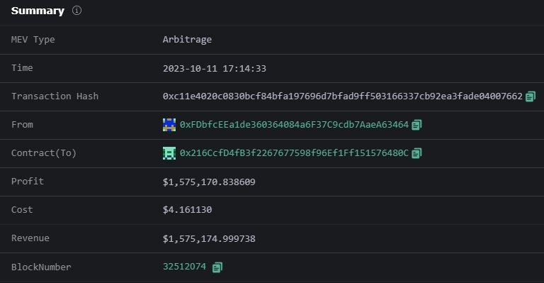 11 октября MEV-бот в сети BNB Chain получил прибыль в размере $1,575 млн за счет атаки с использованием мгновенного займа торговой пары BH/USDT на PancakeSwap, согласно EigenPhi.