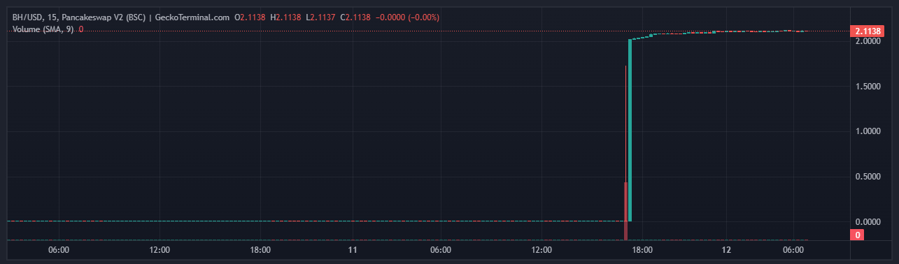 11 октября цена BH неожиданно взлетела с уровня $0,01 до примерно $2 в паре с USDT на PancakeSwap. Этому движению предшествовало резкое падение котировок. На момент написания токен торгуется вблизи отметки $2,1.