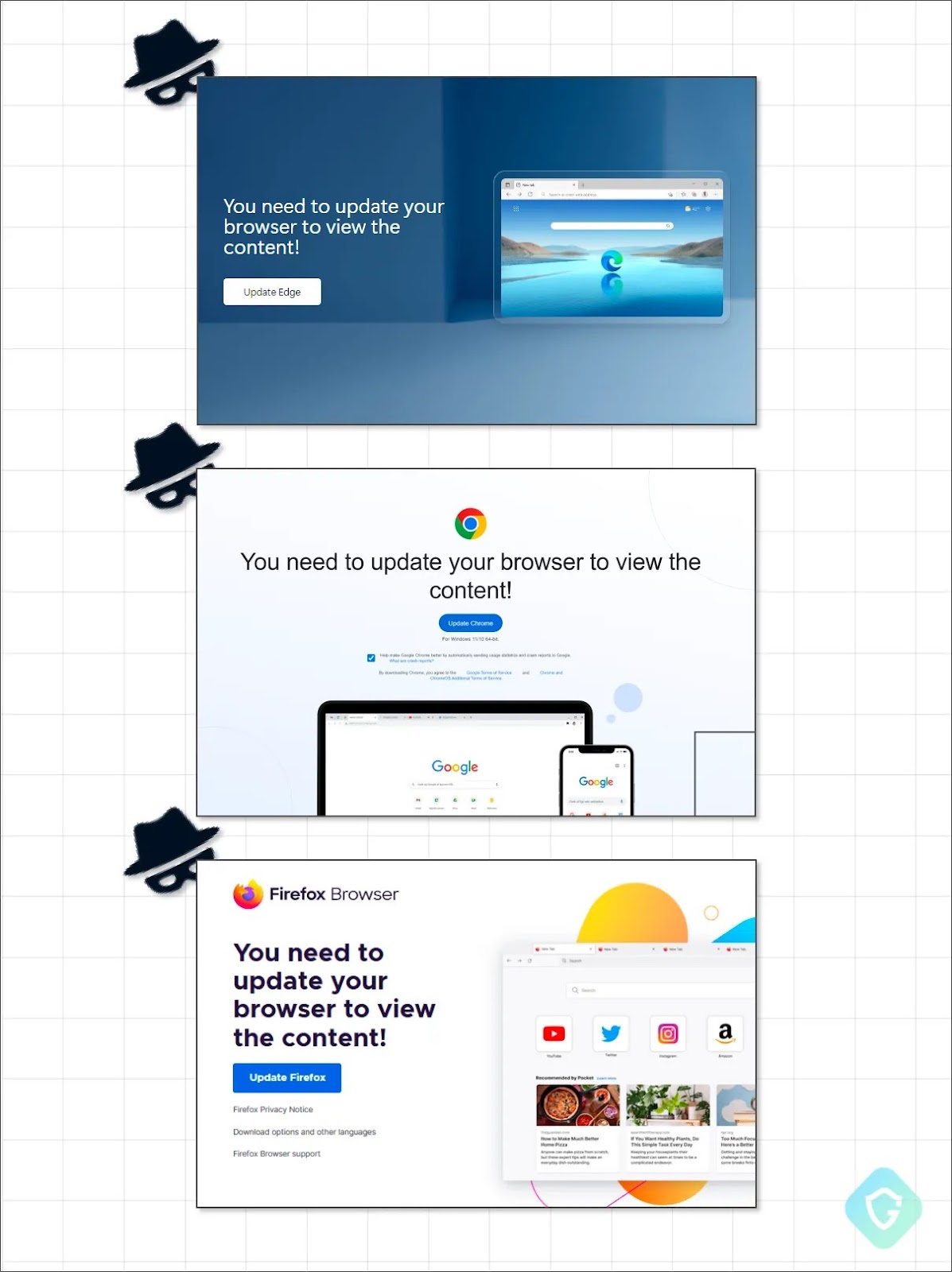 В одном из обнаруженных экспертами методов, жертвам предлагается обновить браузер для доступа к запрошенному контенту. При переходе по ссылке пользователь загружает вредоносное ПО, заражая компьютер с контролируемого хакерами домена.