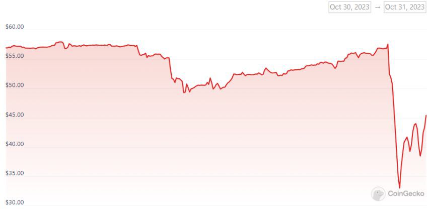 На момент написания материала стоимость актива упала на 25%, согласно CoinGecko. Сейчас токен торгуется по $43,23. При этом за один час после взлома цена UNIBOT опускалась на 36% до $32.