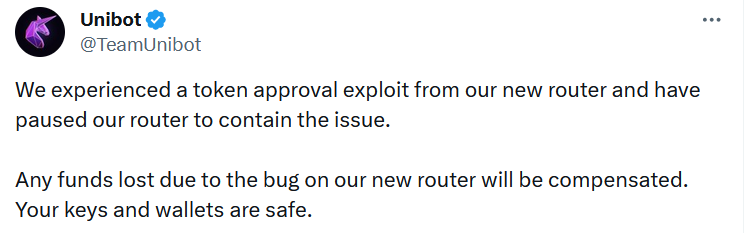Разработчики Unibot отметили, что все похищенные средства будут возмещены пользователям. Совокупный ущерб составил 305 ETH и 39 тыс. USDC (около $649 тыс.).