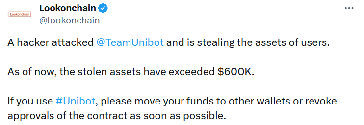 Злоумышленник взломал популярного Телеграм-бота Unibot. По данным Lookonchain, сумма потерь превысила $600 тыс. На фоне новостей цена нативного токена проекта UNIBOT в моменте опустилась на 36%.