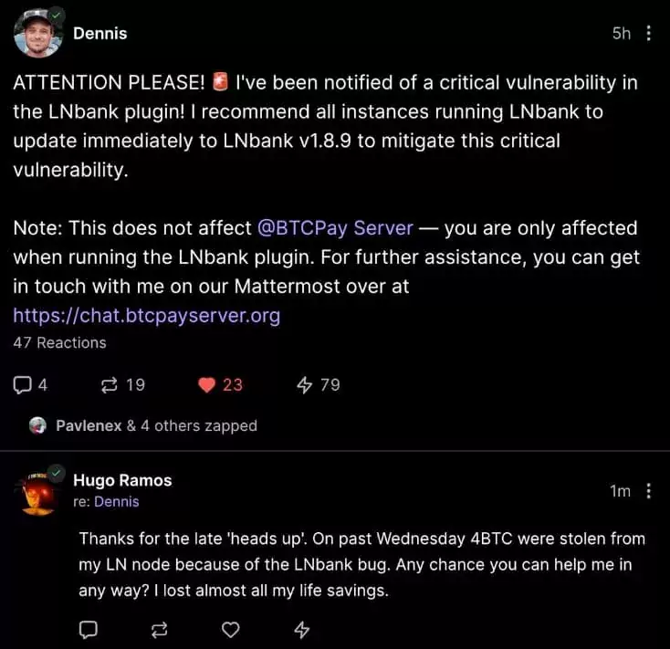 LNBank — это плагин Lightning Network, разработанный Деннисом Рейманном из BTCPay Server. Заметим, что сообщил об ошибке на NOSTR через два дня после инцидента с португальским биткоин-инвестором: