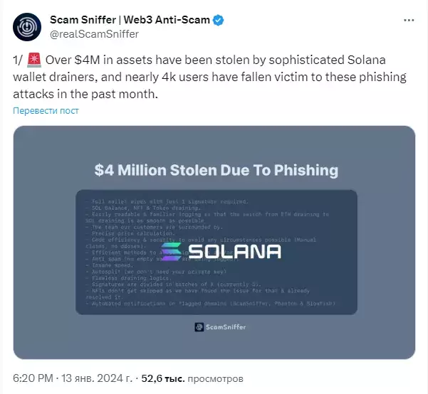 По оценкам компании Scam Sniffer, которая ведёт статистику по мошенничеству в криптосфере, в декабре 2023 года посредством фишинга из кошельков Solana было украдено более $4 млн, а от фишинговых атак пострадало около 4000 пользователей.