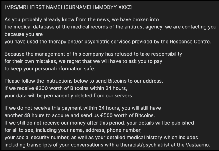По версии следствия, в 2020 году подозреваемый якобы потребовал 40 BTC, чтобы не публиковать личные данные более 33 000 пациентов психотерапевтического центра Vastaamo. Хакер использовал псевдоним ransom_man.