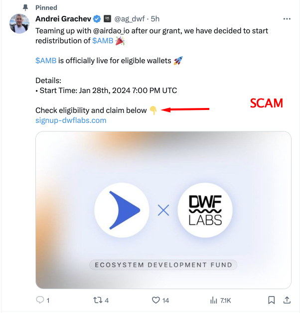 В уже удаленном твите мошенники написали о сотрудничестве Грачева с AirDAO, управляемой сообществом экосистемой децентрализованных приложений (dApps) в сегменте Web3. В честь такого события они объявили начало раздачи бесплатных токенов AMB.