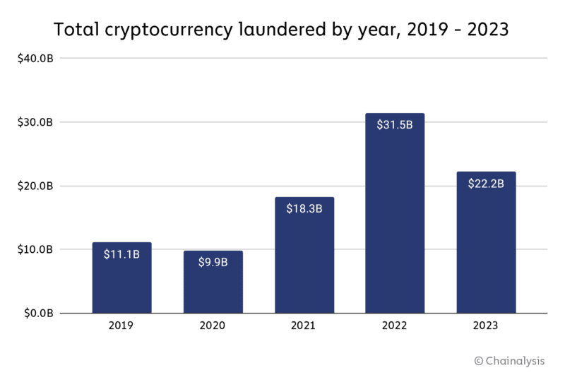 В 2023 году при помощи цифровых активов отмыли $22,2 млрд. Годом ранее этот показатель составлял $31,5 млрд, отмечают в Chainalysis. Эксперты подчеркнули, что отмывание денег посредством криптовалюты составляет лишь 1% от глобального оборота таких операций. По их мнению, годовой объем отмытых средств превышает $2 трлн.