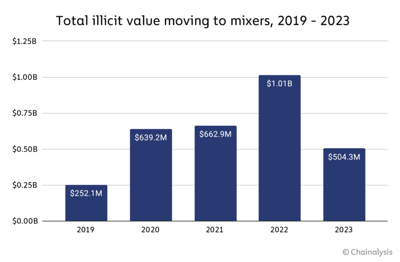 Аналитики отмечают, что использование хакерами криптомиксеров сократилось вдвое. В 2023 году злоумышленники отмыли через эти сервисы $504,3 млн.
