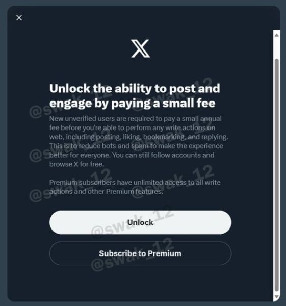 Платную подписку на X уже протестировали в Новой Зеландии и на Филиппинах. Судя по опубликованному скриншоту, новые неверифицированные посетители соцсети будут вынуждены делать ежегодный денежный взнос, чтобы ставить лайки, отвечать на посты, добавлять публикации в закладки и оставлять сообщения.