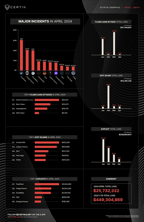 По данным CertiK, в прошлом месяце криптовалютные проекты потеряли в общей сложности $25,7 млн. По сравнению с мартом показатель снизился на 141%.