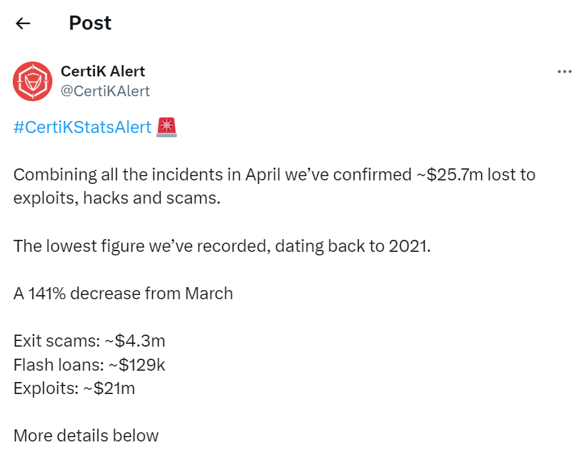 Согласно отчету, потери от хакерских атак, эксплоитов и мошенничества снизились на 141% по сравнению с предыдущим месяцем. Снижение в основном связано с отсутствием компрометации закрытых ключей. В апреле произошло всего три утечки закрытых ключей, тогда как в марте было зафиксировано более 11 атак с использованием компрометации закрытых ключей.