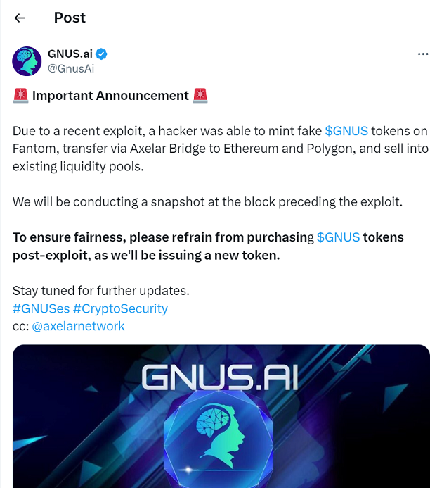 5 мая сеть искусственного интеллекта Gnus.AI потеряла около 1,27 миллиона долларов из-за эксплоита с выпуском токенов. Команда объявила о планах выпустить новую версию токена Genius (GNUS) и о том, что пользователи больше не должны покупать старую версию.