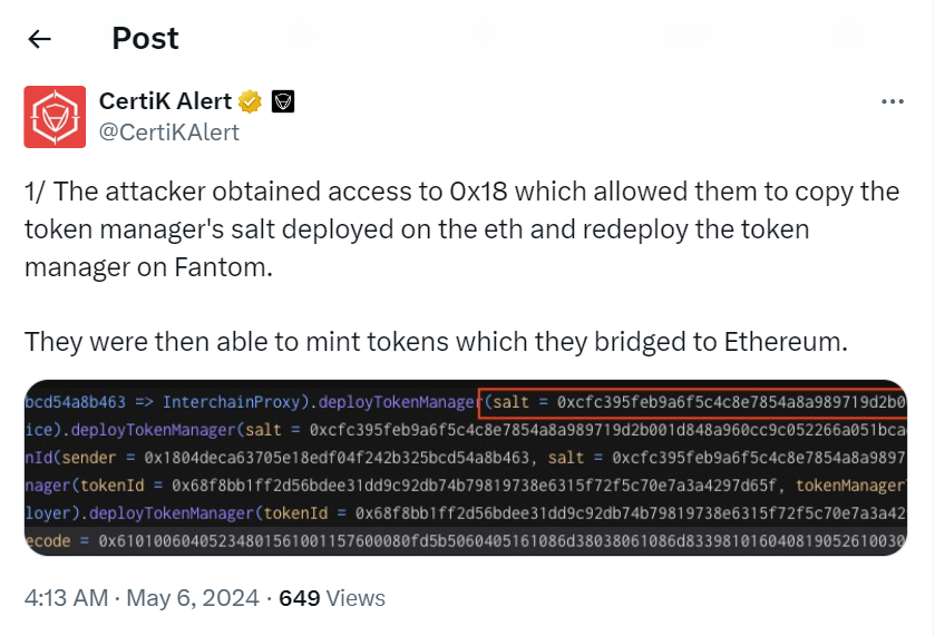 Согласно сообщению от 6 мая компании CertiK, занимающейся безопасностью блокчейнов, злоумышленник реализовал эксплоит, получив закрытый ключ к учетной записи команды, который начинается с 0x18. Получив контроль над этой учетной записью, он скопировал «солевые» данные токена из Ethereum, что позволило ему использовать протокол моста Axelar для создания сетевой версии токена в сети Fantom.