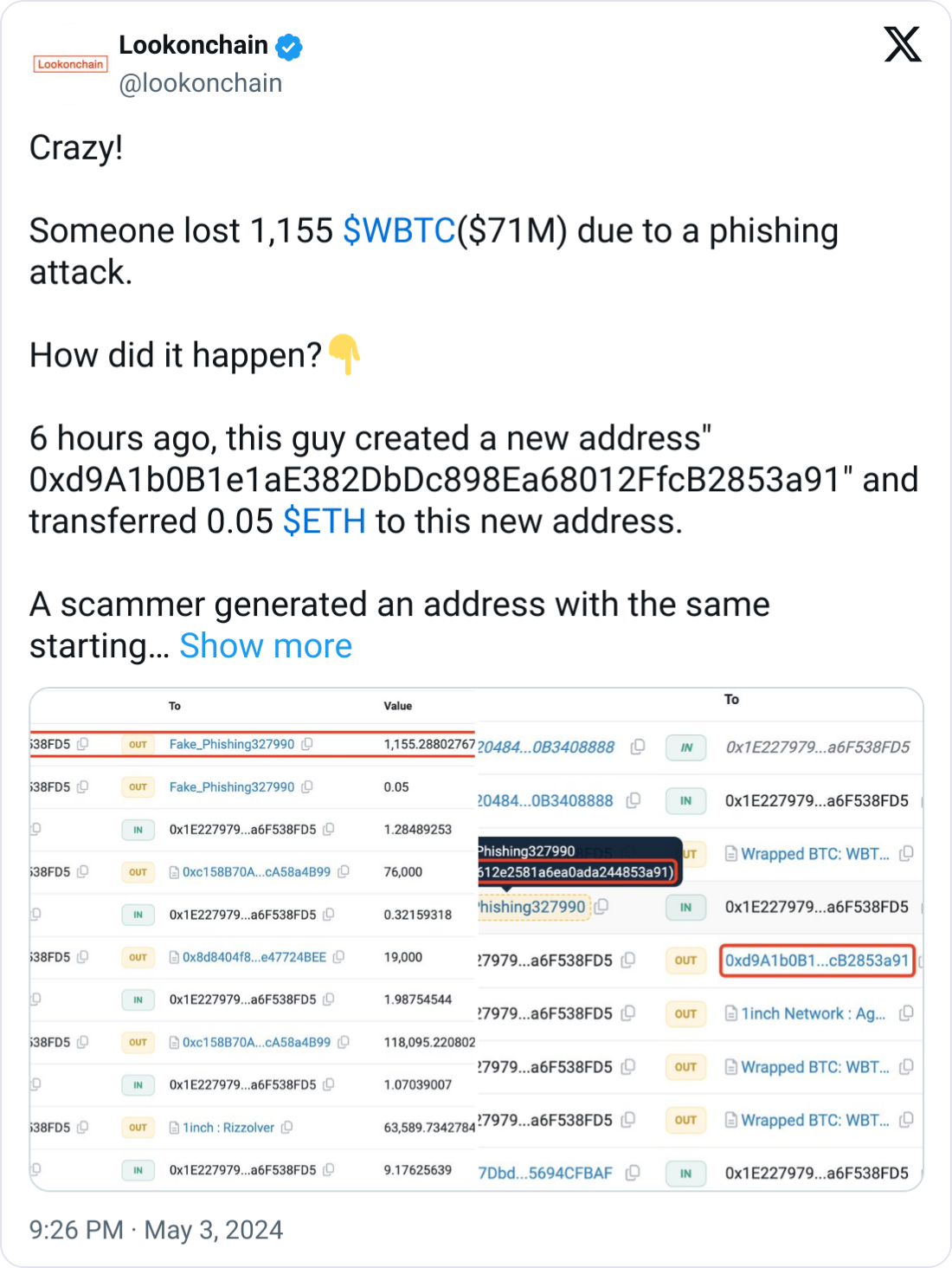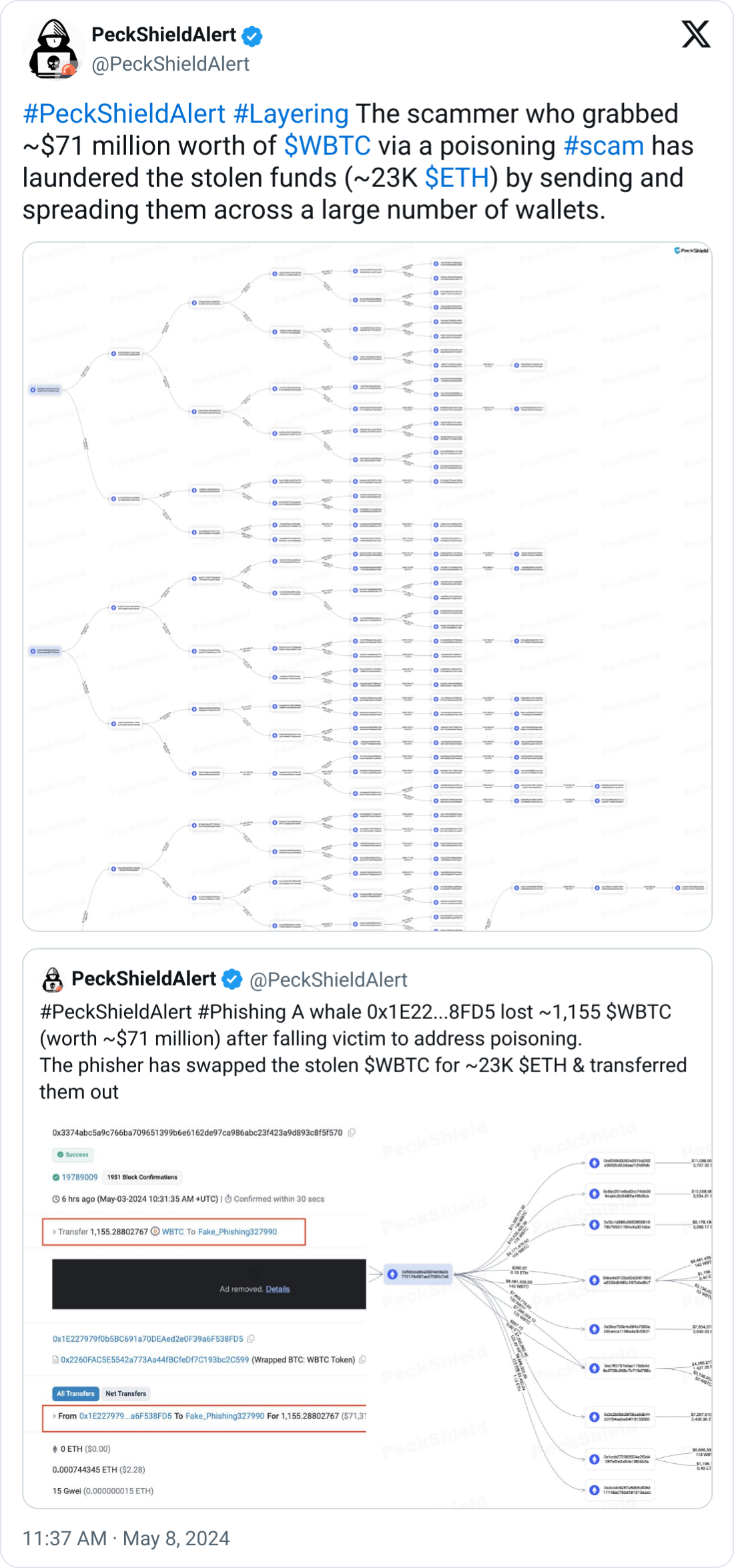 3 мая инвестор отправил Wrapped Bitcoin (WBTC) на сумму 71 миллион долларов на адрес кошелька-приманки, став жертвой мошенничества с отравлением адреса. Мошенник создал адрес кошелька с похожими буквенно-цифровыми символами и осуществил небольшую транзакцию на счет жертвы.