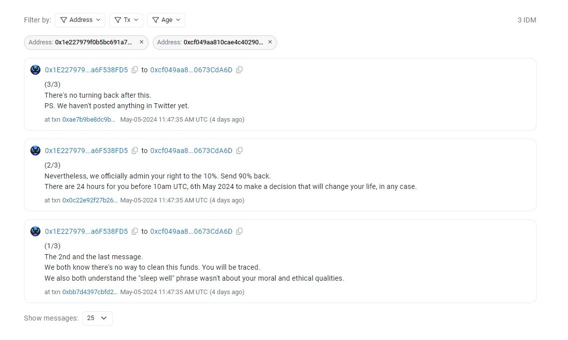 Атака с отравлением состоялась 3 мая, в её рамках злоумышленник рассылал жертве многочисленные транзакции на основе блокчейна, надеясь, что в суматохе пользователь скопирует адрес мошенника вместо своего собственного.