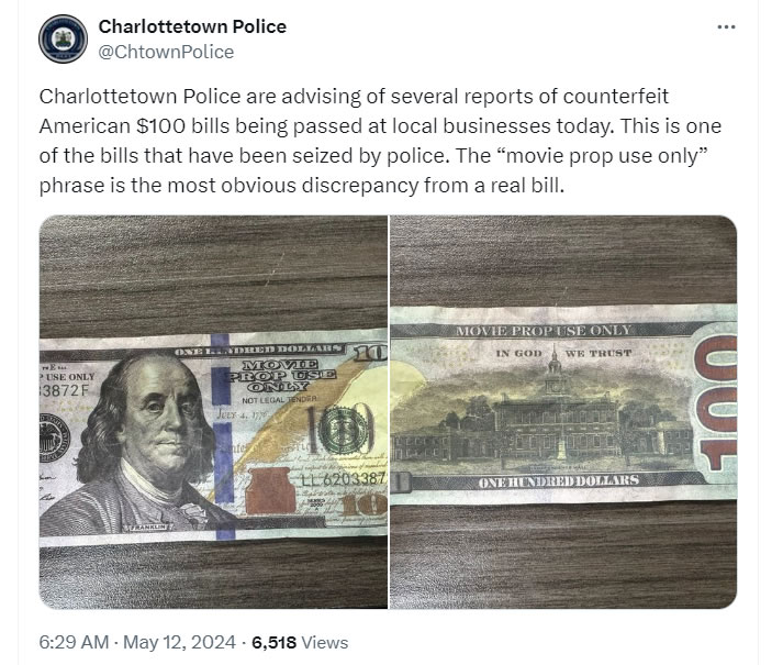 Ранее в этом году сообщалось, что в Онтарио, Канада, ходили фальшивые стодолларовые купюры. 12 мая полиция Шарлоттауна, Канада, предупредила, что местные предприятия продают поддельные американские стодолларовые купюры, используемые в качестве реквизита для фильмов.