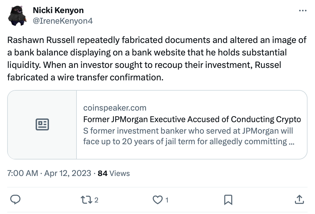 Осуждение Рассела - одно из множества мошенников, которые предстали перед правосудием за последние два месяца. 12 апреля инженер по компьютерной безопасности Шакиб Ахмед был приговорен к трем годам тюремного заключения с последующим освобождением под надзором на три года в окружном суде Южного Нью-Йорка за внезапные кредитные атаки на криптовалютные биржи в 2022 году.
